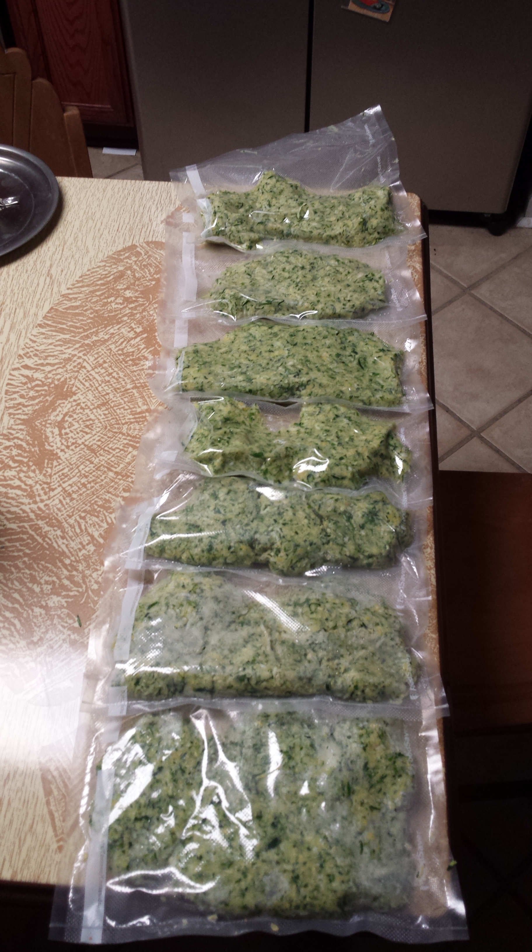When it was all said and done and the water was out of my zucchini I was left with about 15 cups. I did 2 cup portions in my food saver, and prayed I had enough on the roll, because I would never actually think of purchasing freezer bags ahead of time.